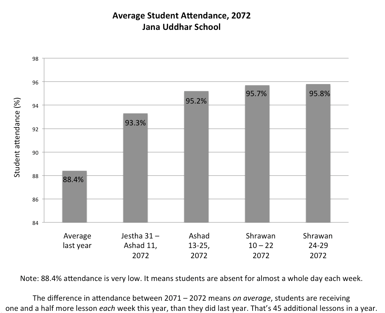 88.4% attendance sounds quite good. It’s not. It means that on average, students are missing almost a day of school each week (we have a six day week).