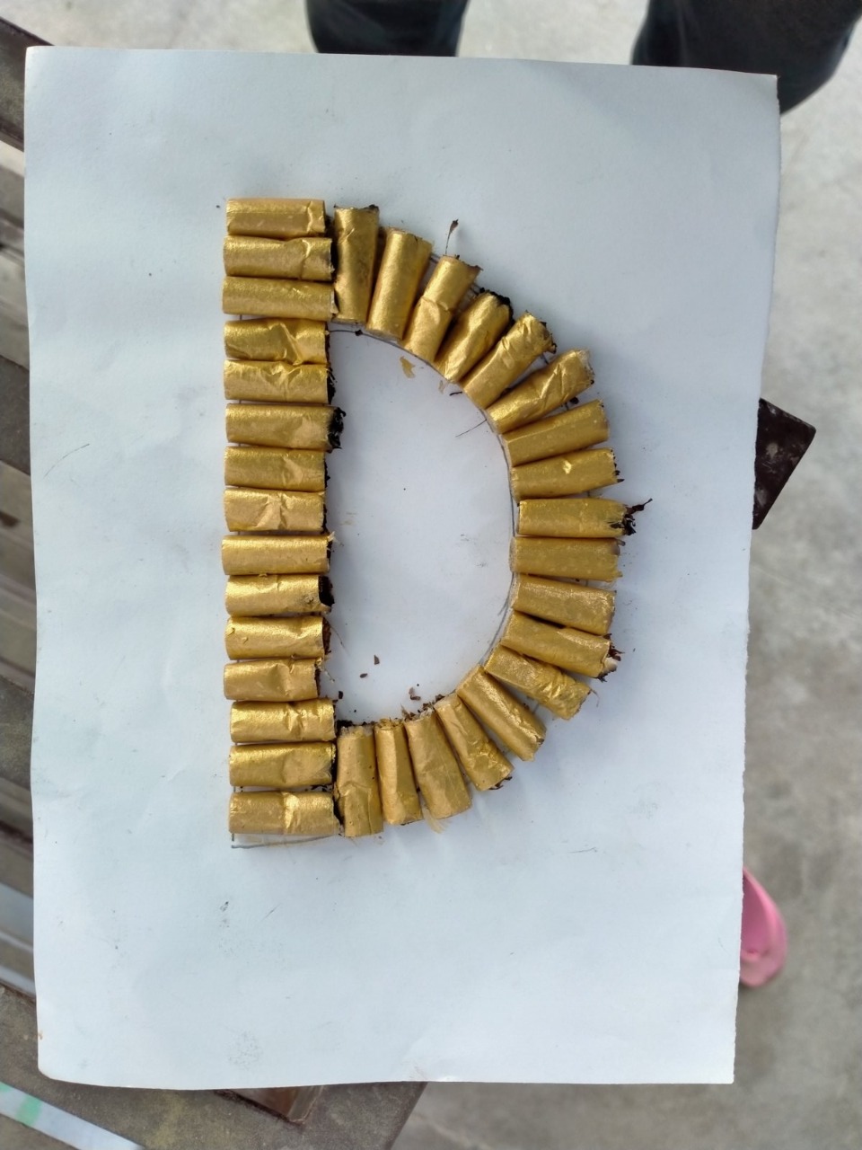 …yes, that is the letter ‘D’ made from cigarette butts!